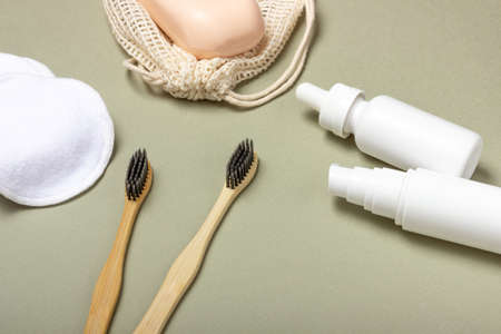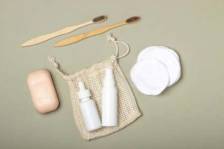Wooden toothbrush, solid shampoo, handmade soap, cotton makeup remover wipes. Zero Waste Concept Eco-Friendly Body Care Cosmetics