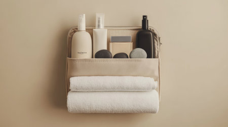Compact toiletry bag with different cosmetic products spa stones and towel on beige background - ai