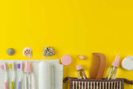 A set of cosmetics and personal care products for travel in a cosmetic bag on a bright yellow background. top view. travel cosmetics