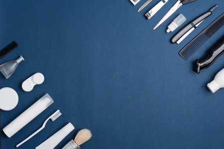 Flat lay of male cosmetic products for men body care grooming and shaving
