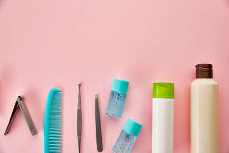 Different personal hygiene objects on white and pink turkish towel background, top view