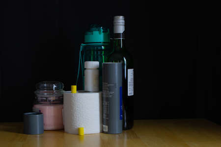 Vacation at home concept. Hand sanitizer gel bottle, glasses, car, cactus and other items on table