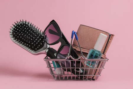 Minimalistic shopping concept. Mini shopping basket with female accessories on pink pastel background