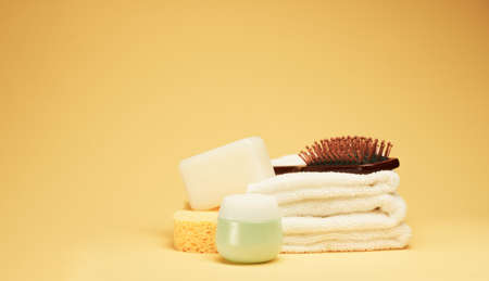Bath and spa accessories. Soap, towels, moisture and hair brush over yellow background