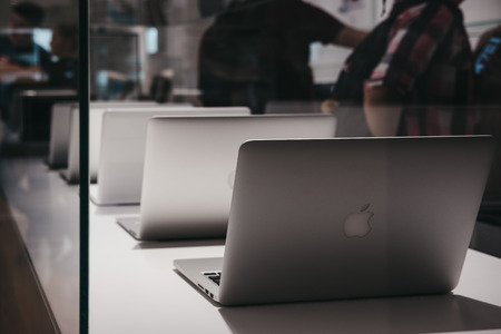 Prague, Czech Republic - August 28, 2018: Range of MacBooks on display inside Apple Museum in Prague, the largest private collection of Apple products around the world.
