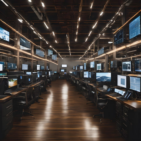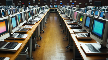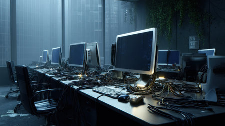 Rows of computers line an empty office space, highlighting the stark, modern workspace. Focus on technology and business environment.
