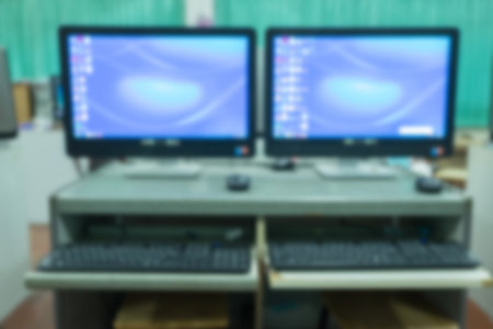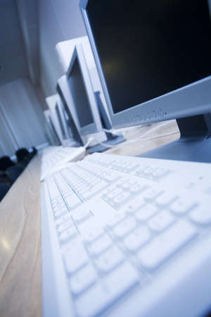 Group of desktop computers on the table in computer lab room - Close-up shot
