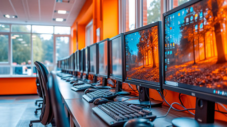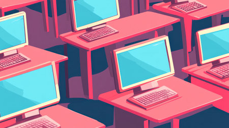 A vibrant classroom scene featuring desks and computers, ideal for themes of education and technology. Perfect for showcasing modern learning environments.