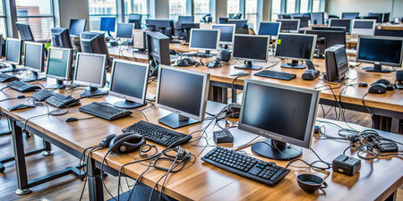 perspective closeup view with shallow depth of field of row of desktop workstation computers with cables in a digital college training centre