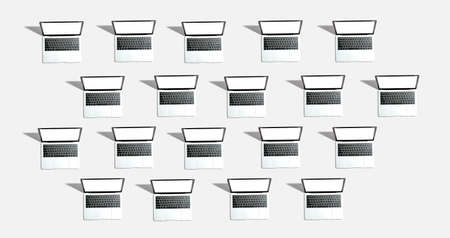 Many laptop computers blank light screen placed on dark mirror desk with dark background. 3D Rendering image.