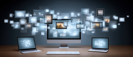 Modern workstation blending desktop and laptop screens into digital collage showcasing cloud content sharing and multimedia productivity sleek