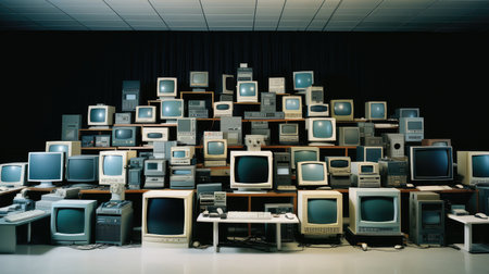 A vibrant installation of old computer monitors against a clear blue sky, representing technology evolution and vintage aesthetics, creating a nostalgic atmosphere