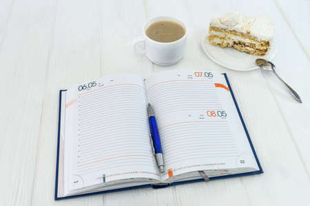 Diary with cup of coffee and piece of cake