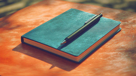 A striking blue notebook lies on an orange surface beside a sleek black pen, illuminated by soft natural light, creating an inviting and warm atmosphere.