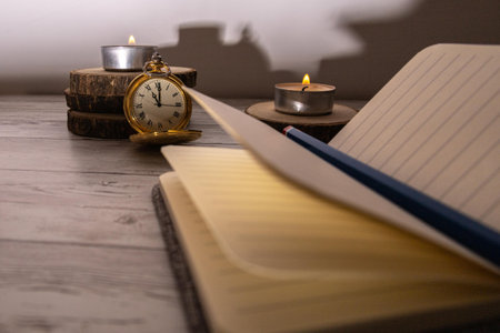 selective focus of an antique clock and a notebook hoping to get ideas for writing down