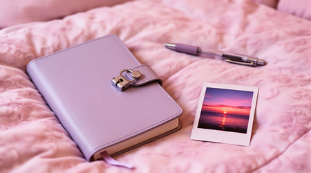 Lavender journal and pen on pink blanket with sunset photo. That the image is generated using AI.