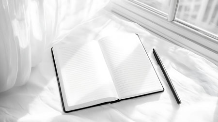 Notebook on the bed with a pen. Black and white.