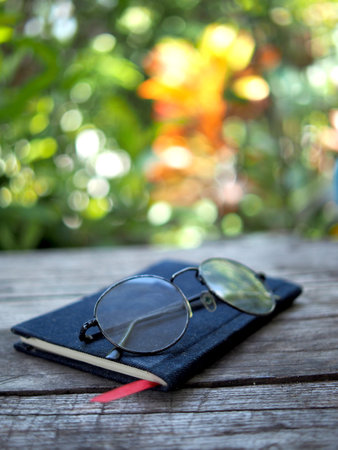 Notebook and glasses on a wooden table in the garden. Selective focus.