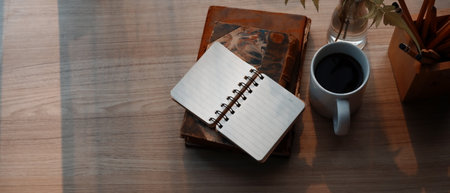 Office desk wooden table with coffee and notebook, black and white tone. Top view of business concept, copy space and vignette effect style.