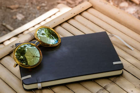 Glasses and notebook on the natural wooden bamboo table background for the concept of finance life future design planing style