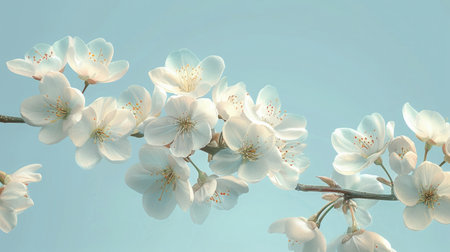 Captivating white blossoms adorn a slender branch, showcasing nature's beauty. The soft blue background enhances the delicate petals, evoking tranquility.