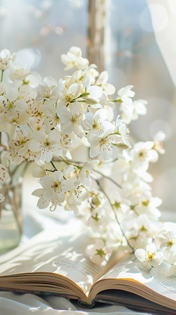 Soft white flowers bloom in spring, bringing brightness and clarity to the scene, symbolizing freshness and new beginnings in nature.