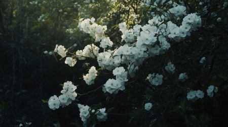 A captivating display of delicate white flowers in full bloom surrounded by lush greenery, illuminated by soft sunlight, creating a serene and tranquil atmosphere.