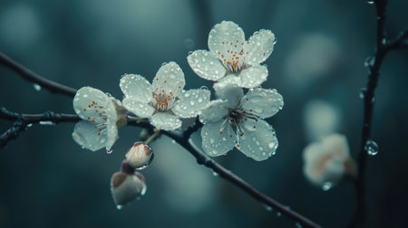 A stunning closeup of cherry blossoms adorned with raindrops, capturing the essence of spring. The soft petals reflect tranquility and natural beauty.