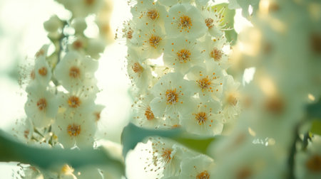 Flowers grow in spring, creating a soft white background with bright light. Nature displays simple beauty with clear details of blossoms.