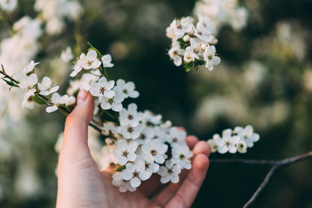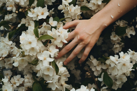 A hand is reaching into a field of white flowers. Concept of peace and tranquility, as the hand gently touches the delicate petals of the flowers