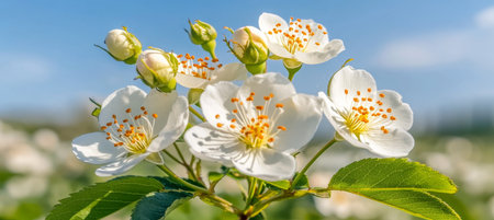White Rose Blossoms with Orange Pistils Against a Blue Sky, Green Leaves and Buds in Springtime