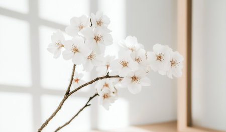 A delicate branch of white blossoms showcases natural beauty against a soft neutral background, perfect for adding a serene and elegant touch to any design project.