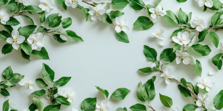 Apple blossom branches with fresh green leaves arranged on pastel background, creating a natural floral frame and spring atmosphere.