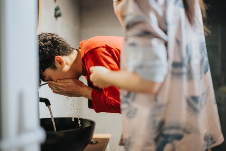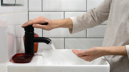 A person washes hands at a white bathroom sink, water splashing as soap lathers. Cleanliness, hygiene, and daily home routines are highlighted in a candid moment of self-care.