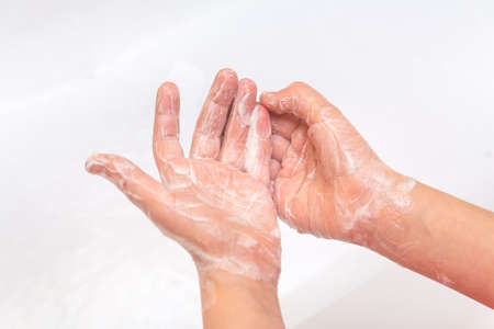 Child lathers his hands with soap close-up on a white background. Hygiene concept. Disease prevention, health care, body care. Virus protection. Pandemic, covid-19.