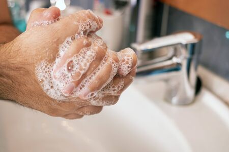 Washing hands rubbing with soap man for corona virus prevention. Personal hygiene, prevention of COVID-19. Stop the spread of coronavirus.