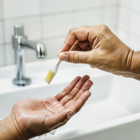 A detailed close-up image captures the act of cleaning a toothbrush under a running faucet, highlighting the importance of maintaining oral hygiene.