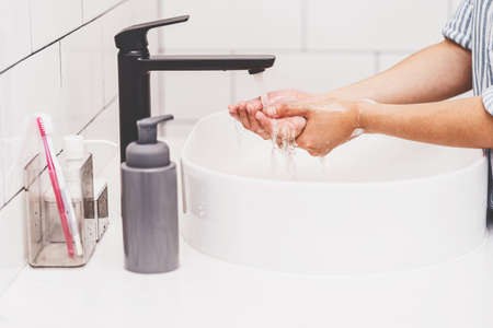 Washing hands with soap and hot water at home bathroom sink women cleansing hand hygiene for coronavirus outbreak prevention. Corona Virus pandemic protection by washing hands frequently.