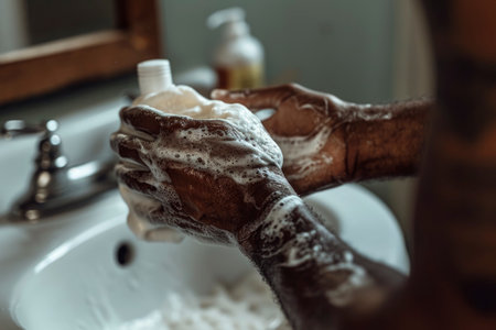 top view of person thoroughly washing hands at bathroom sink with soap and hot water