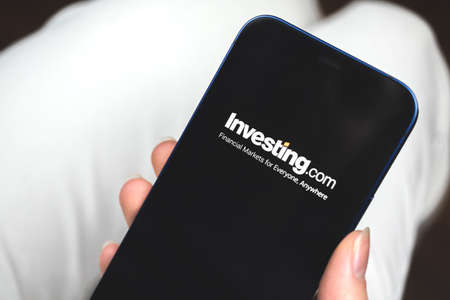 Kharkov, Ukraine - January 10, 2022: Woman uses Investing.com app. Hand with Apple iPhone, mobile phone with logo