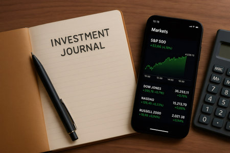 Investment journal, smartphone displaying stock market data with green uptrend chart, and calculator laying on wooden desk suggest successful trading activity