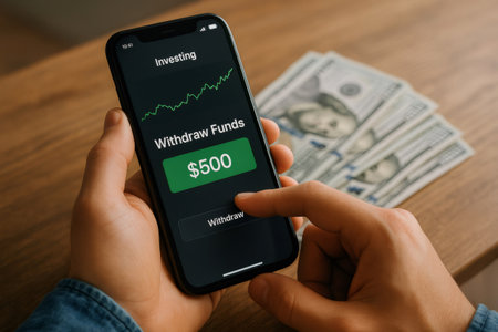 Investor using a smartphone app to withdraw funds from investments, with dollar bills in background