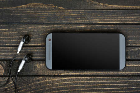 Vintage photo, Mobile phone, smartphone with headphones on wooden table