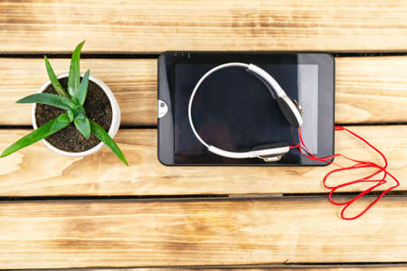 Black notepad, headphones, coffee on a wooden background. Work environment