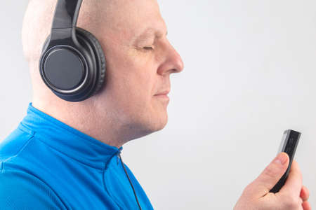 man with closed eyes listens to music with headphones on a light background
