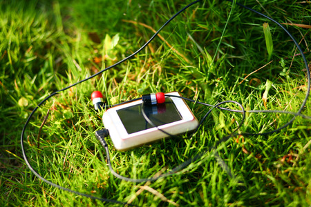 pink mp3 player with earphones on green background