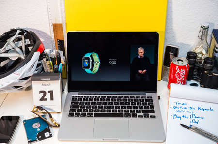 PARIS, FRANCE - MARCH 21, 2016: Apple Computers website on MacBook Pro Retina in a creative room environment showcasing Apple Event with new woven nylon bands for Apple Watch