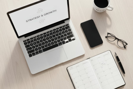 A laptop displays a strategy and growth presentation beside a planner, smartphone, pen, and coffee cup on a light wooden desk. The setup suggests planning and productivity in a modern workspace.