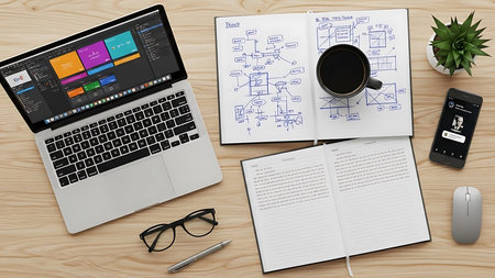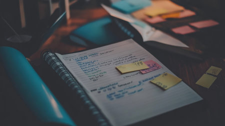 Desk scene with notepad, sticky labels, and open planner under soft lighting