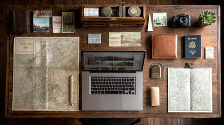 An engaging flat lay of a travel-themed workspace featuring a vintage map, camera, and laptop, ideal for planning adventures and capturing experiences.